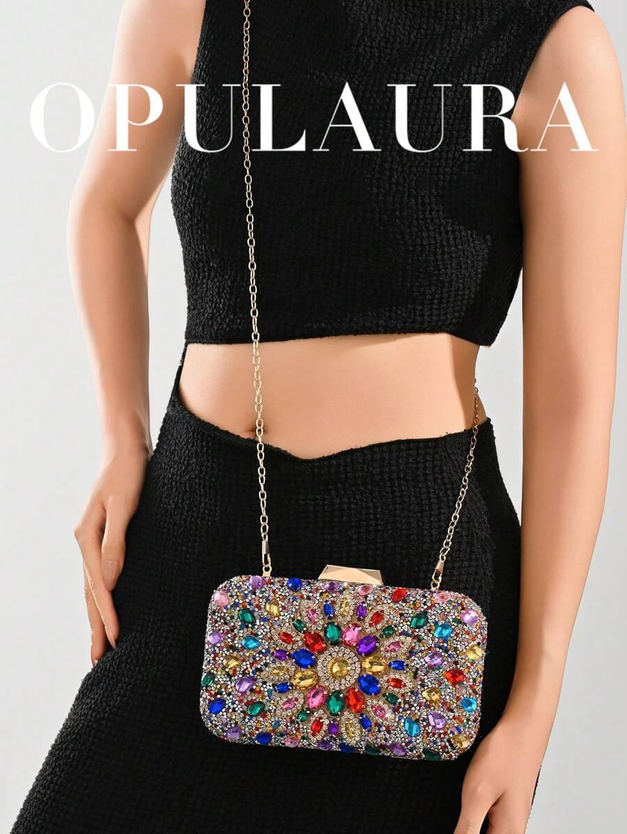 This fashionable Opoloura handbag shines with hand-applied crystals across its structured silhouette, mimicking diamond luxury for head-turning appeal at evening events or bridal celebrations. The elegant chain strap allows clutch or shoulder carry, while the secure clasp keeps essentials safe in its compact interior. Timeless yet trendy, it pairs perfectly with gowns or cocktail attire for unforgettable style.