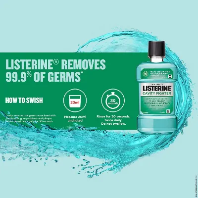 Did you know? Brushing cleans only 25% of your mouth. Germs left behind in your mouth may cause bad breath, plaque and gum problems. Listerine Cavity Fighter Mouthwash reaches all parts of your mouth and removes 99.9% germs to help prevent gum problem, bad breath, & plaque. • Brushing can miss a billion germs, which may lead to various oral problems • Listerine reaches all parts of your mouth, removes 99.9% germs and helps strengthen teeth and prevent cavities • The power of 4 essential oils combined with sodium fluoride in Listerine Cavity Fighter mouthwash helps strengthen teeth and prevent cavities • Ideal for those who have orthodontic attachments, helps to clean the areas in the mouth which brushing misses • For best results, rinse with undiluted 20ml Listerine twice a day for 30 seconds. Don’t rinse mouth with water or eat and drink anything for 30 minutes’ post rinse. • Suitable for ages 12 and above How to use: • Rinse with undiluted (do not mix it with water) 20ml twice a day for 30 seconds. • Don’t rinse mouth with water or eat and drink anything for 30 minutes’ post rinse. Precaution: For external use only. Not to be swallowed. Keep out of reach of children. Not recommended for children below 12 years of age. If you accidentally swallow quantity more than used for rinsing, get medical help.