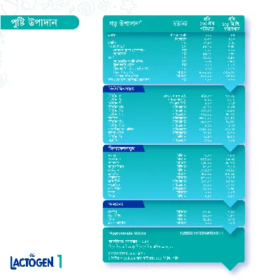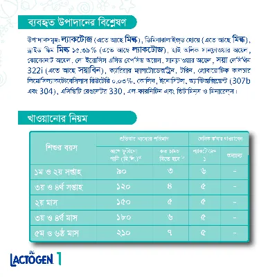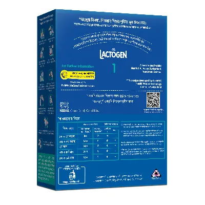 Important Notice: There are no substitutes of or equivalent to breast milk. Nestlé LACTOGEN 1 is produced as per the Bangladesh standard for infant formula. NESTLÉ LACTOGEN 1 is a starter infant formula milk powder for 0 to 6-month-old babies. NESTLÉ LACTOGEN 1 contains: •L.reuteri •lactose •Predominant whey protein •Special fat blend •25 vitamins & minerals •No added sucrose Net Weight: 350gm Manufactured by: Nestlé Bangladesh Limited Formulated by: Nestlé Switzerland S.A. Marketed by: Nestlé Bangladesh Limited.