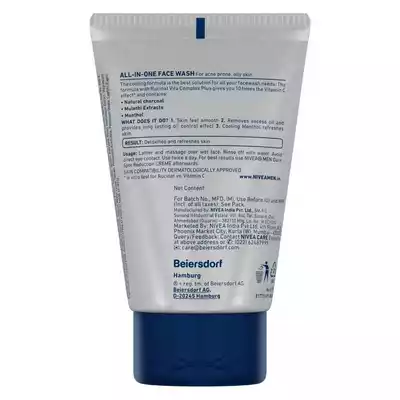 • Get rid of oiliness and reduce acne with NIVEA MEN All-in-1 Face Wash. • The formula enriched with natural charcoal extracts provides long lasting oil control effect to reduce acne. • It deeply cleanses your skin making it smooth and the cooling menthol leaves you feeling refreshed. • Ideal for acne prone and oily skin. The face wash cleans skin and eliminates dirt and impurities. How To Use- Step 1 – Squeeze a pea-sized amount onto your palm and lather up Step 2 – Massage over wet face avoiding the eye area Step 3 – Rinse off with clean water and pat dry Step 4 – Use twice daily for best results
